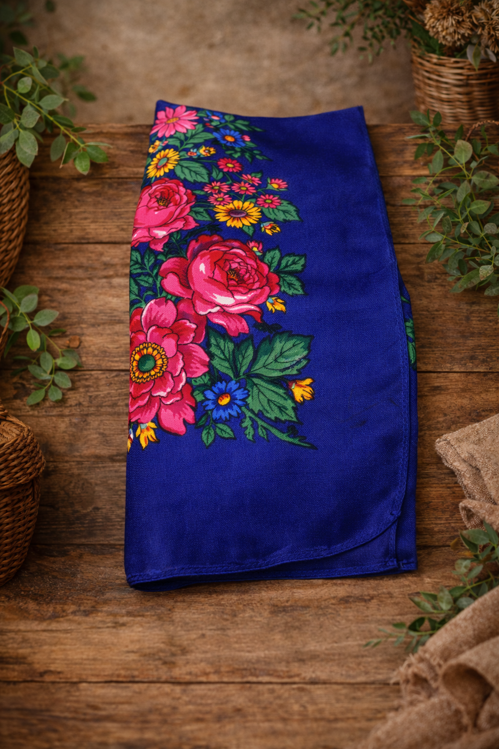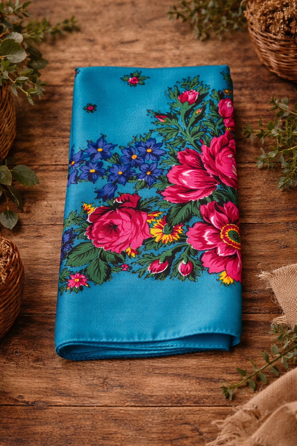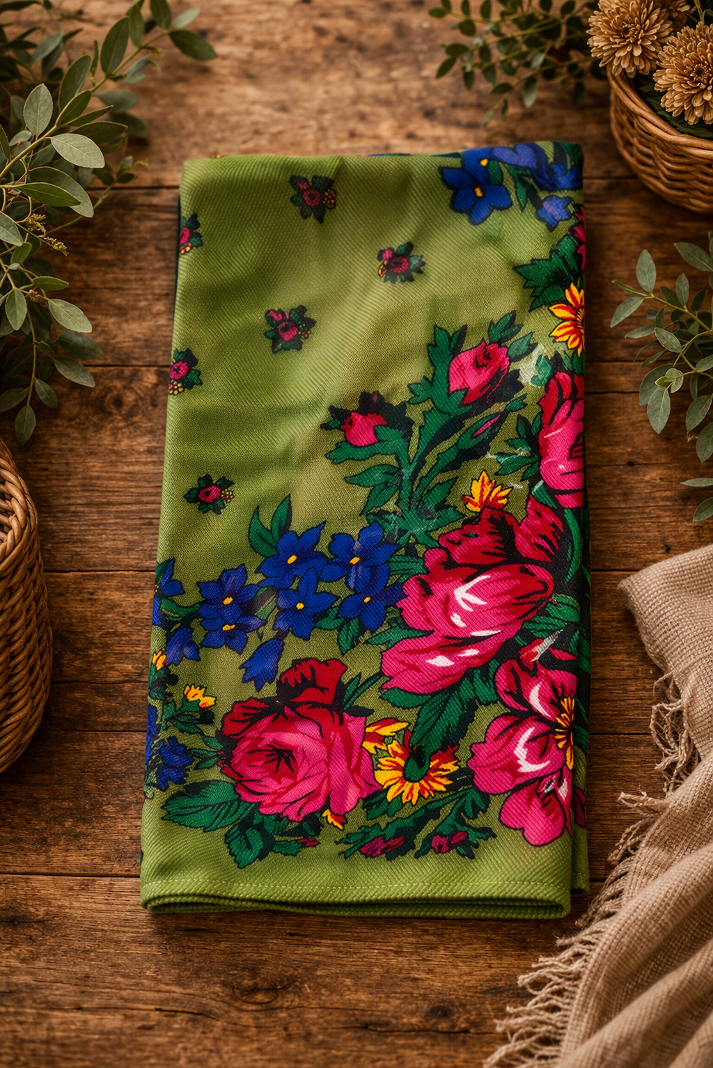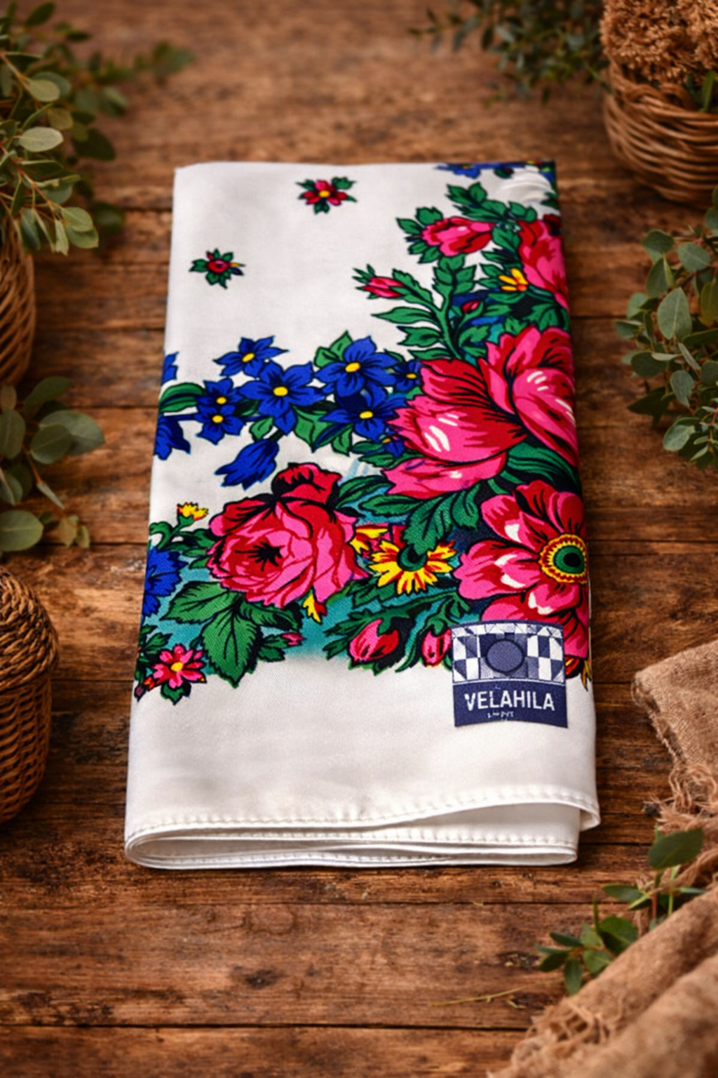 Pañuelo 100% poliéster de 70x70cm. Estampado floral en rama