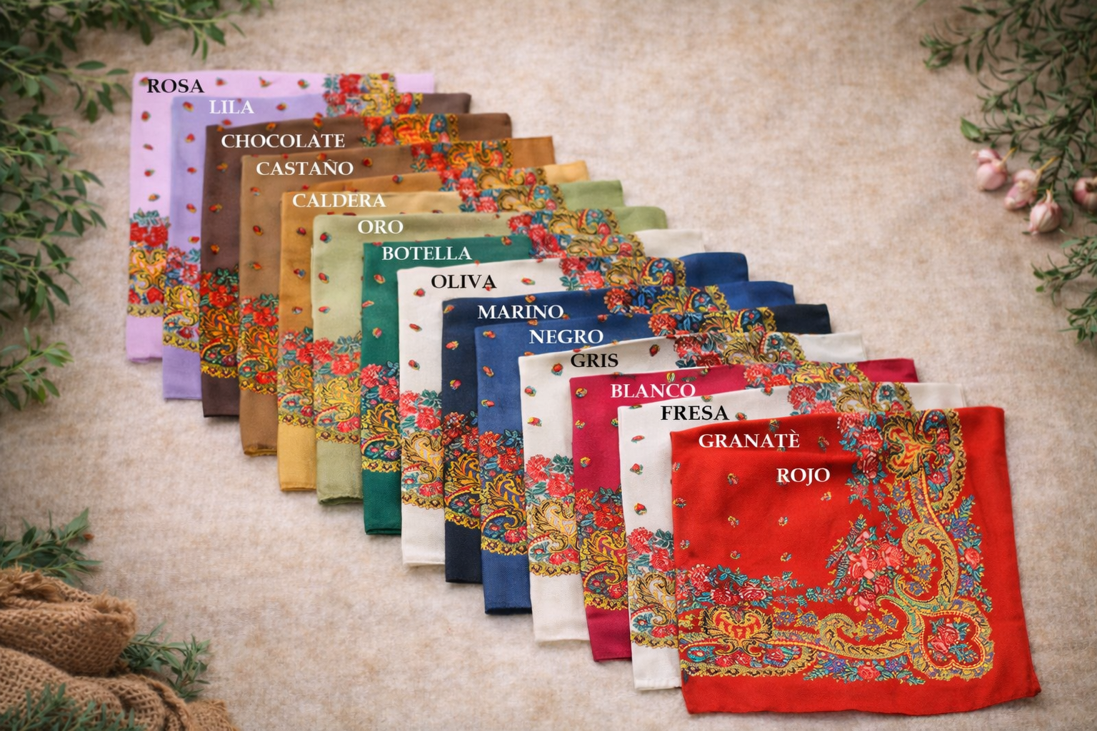 Composición: 100% Viscosa Tamaño: 90x90 cm Observaciones: Máxima calidad. Caida suave.